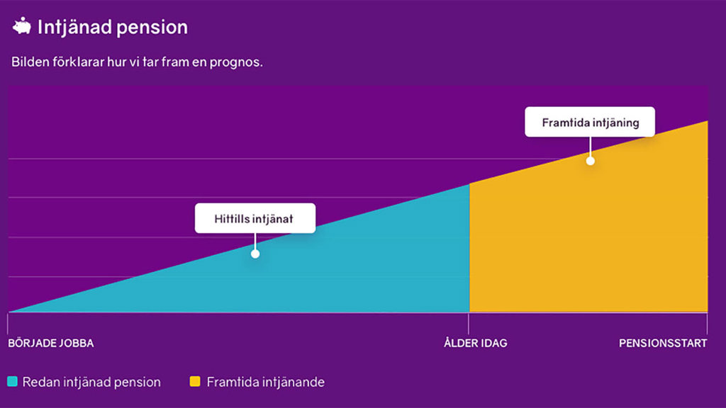 Verktyget ”Intjänad pension” visar din hittills intjänade pension. När du registrerar dig på minPension ger du oss fullmakt att hämta information om dina pensioner från Pensionsmyndigheten och pensionsbolagen.