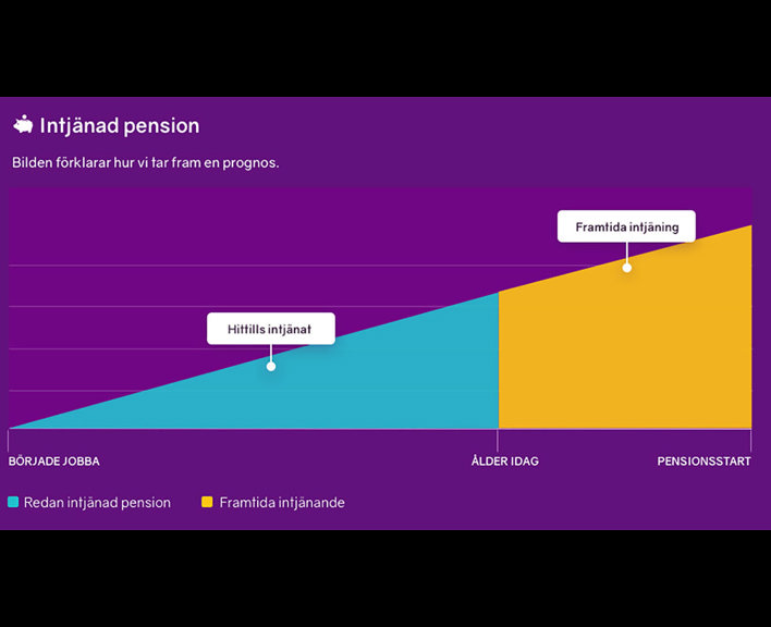 Verktyget Intjänad pension visar din hittills intjänade pension. När du registrerar dig på minPension ger du oss fullmakt att hämta information om dina pensioner från Pensionsmyndigheten och pensionsbolagen.